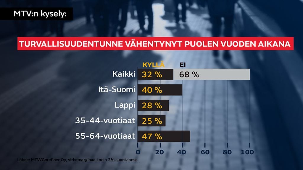 Selvä enemmistö MTV Uutisten kyselyyn vastanneista suomalaisista katsoo, että oma turvallisuudentunne ei ole vähentynyt kodin ulkopuolella liikkuessa viimeisen puolen vuoden aikana. Lähes 1400 vastaajasta näin vastasi hieman alle 70 prosenttia. Reilu 30 prosenttia koki turvallisuudentunteen vähentyneen.