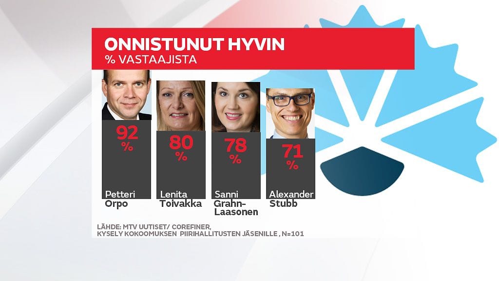 Kokoomuksen piirihallitusten jäsenille tehdyssä kyselyssä eniten kritiikkiä saa puolueen puheenjohtaja, valtiovarainministeri .