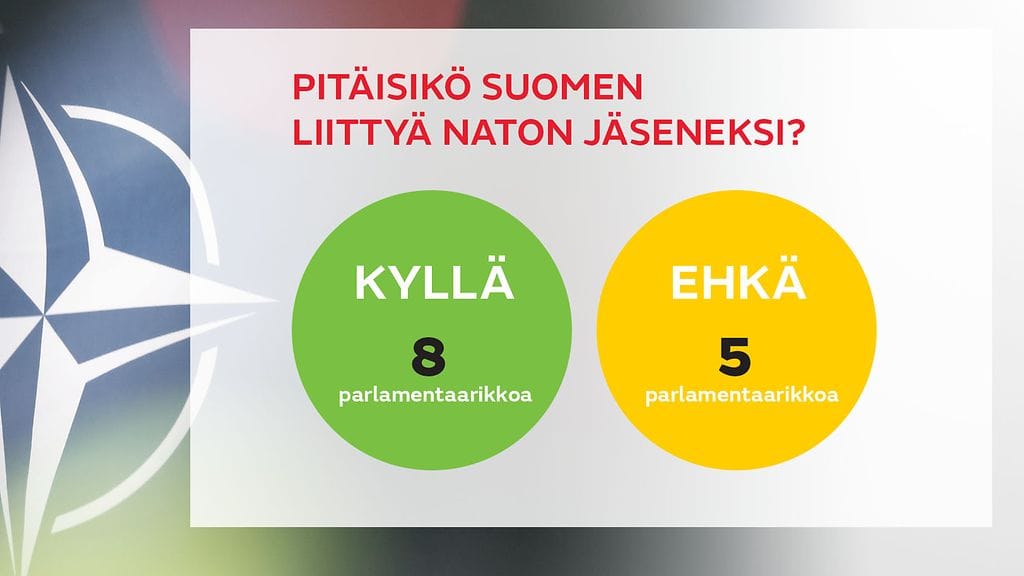 Nato-jäsenyyden ehdottomia kannattajia ovat erityisesti kokoomuksen, vihreiden ja Rkp:n mepit eli Henna Virkkunen (kok.), Sirpa Pietikäinen (kok.), Petri Sarvamaa (kok.), Heidi Hautala (vihr.), Ville Niinistö (vihr.), Alviina Almetsä (vihr.) ja Nils Torvalds (r.).