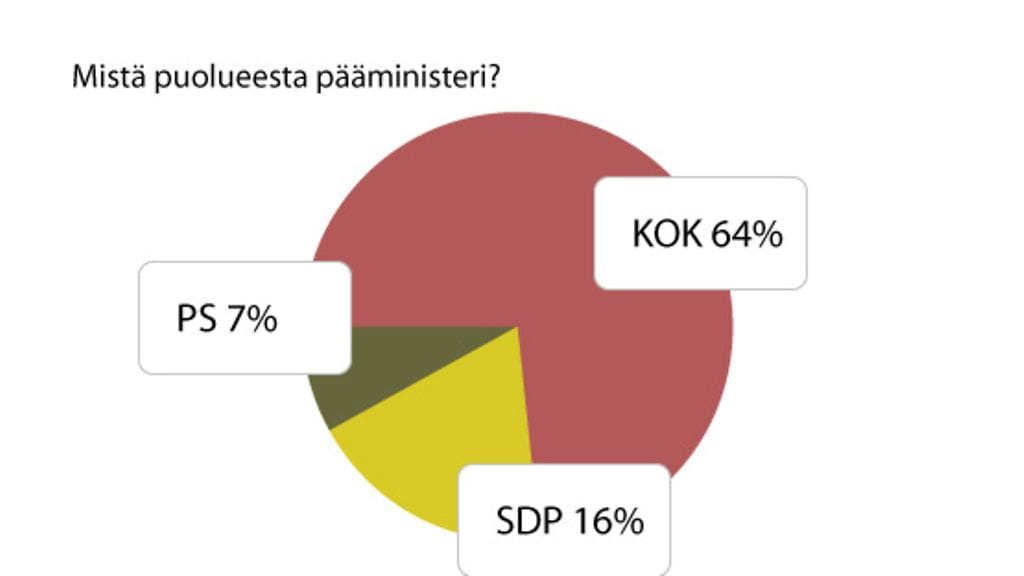 Pääministeri halutaan selkeästi kokoomuksesta. 64 prosenttia vastaajista tahtoisi pääministerin suurimmaksi nousseesta puolueesta. Kakkoseksi pääministerikilvassa nousi SDP 16 prosentin kannatuksella.