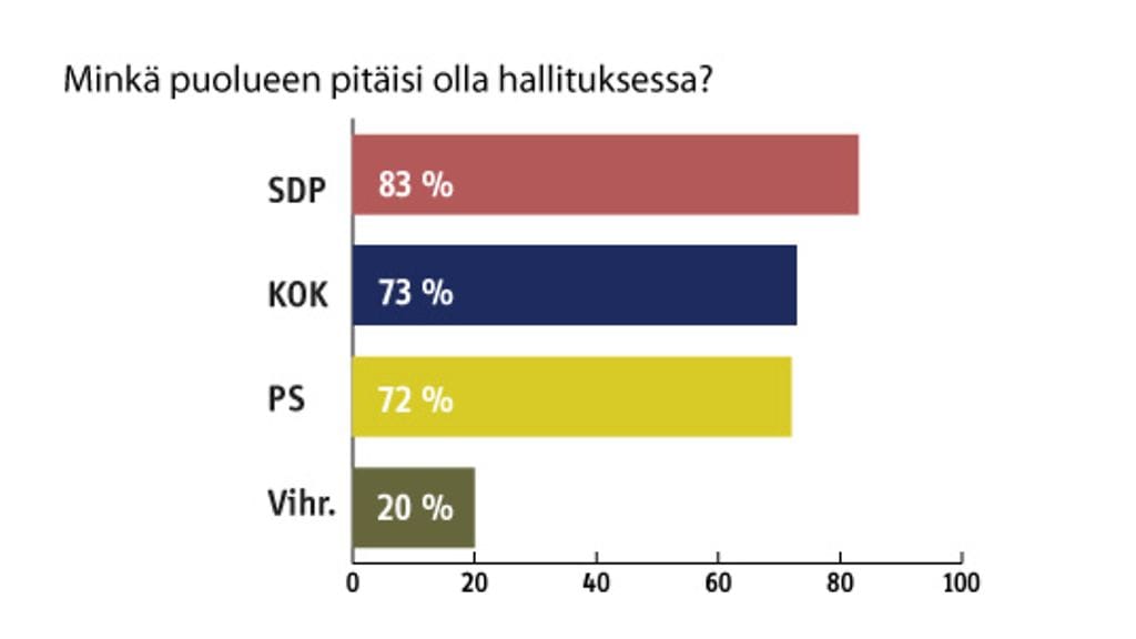 Suomalaiset haluaisivat uuteen hallitukseen kolme suurinta puoluetta. SDP on maan suosituin hallituspuolue, sen ottaisi hallitukseen 83 prosenttia vastanneista. Kokoomuksen näkee hallituksessa 73 prosenttia kansasta. Perussuomalaisten osuus samalla mittarilla on 72 prosenttia.