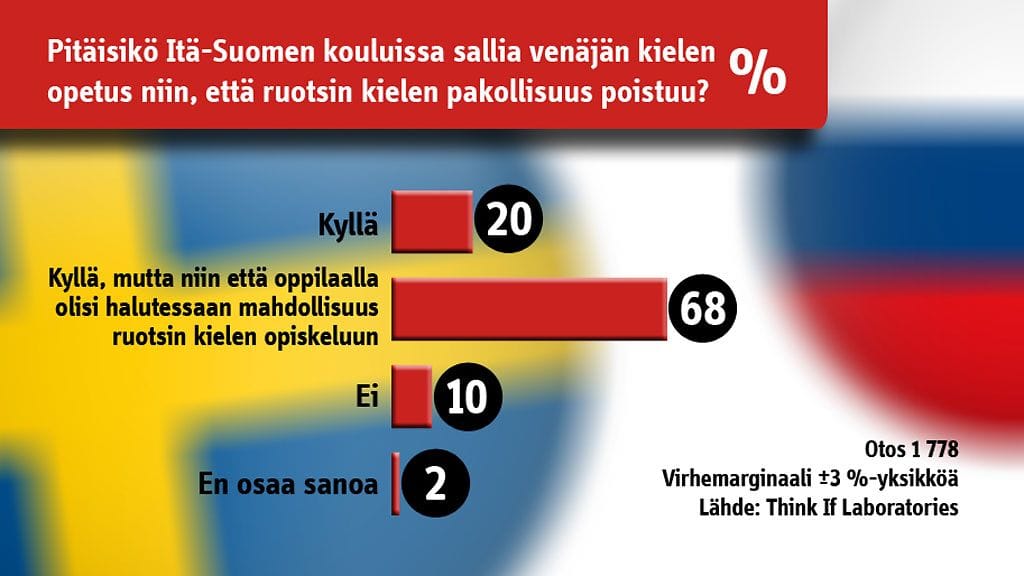 Vastaajista liki 90 prosenttia on sitä mieltä, että venäjää pitäisi halutessaan saada opiskella ruotsin sijaan Itä-Suomen kouluissa. Kymmenen prosenttia vastaajista on taasen eri mieltä.