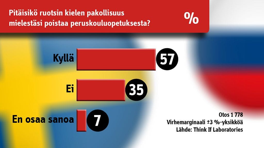Ruotsinkielen pakollisuuden poistamista peruskouluopetuksessa kannatti enemmistö, 57 prosenttia, MTV3 Uutisten tuoreessa kyselyssä.