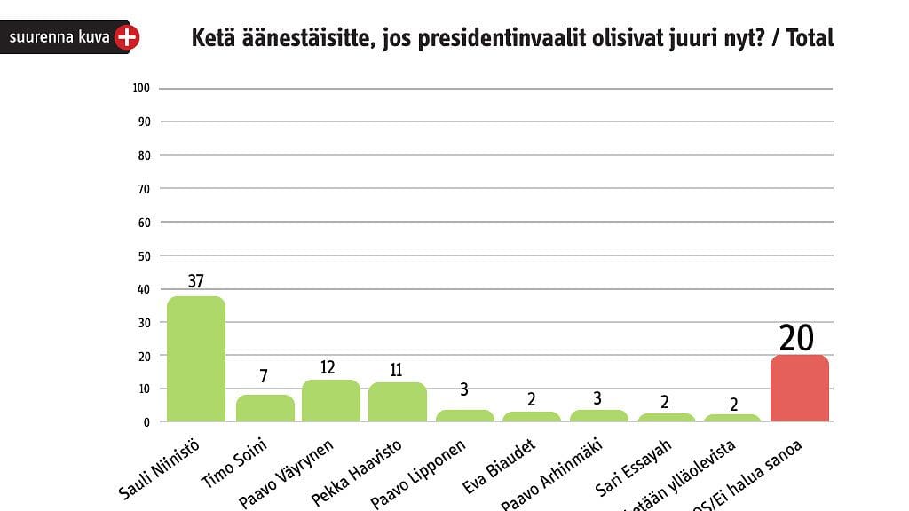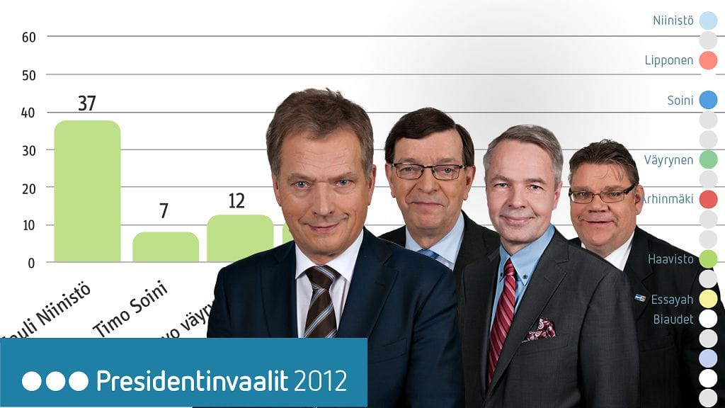 Vaalien ennakkosuosikki, kokoomuksen Sauli Niinistö saa tutkimuksessa 37 prosentin kannatuksen.