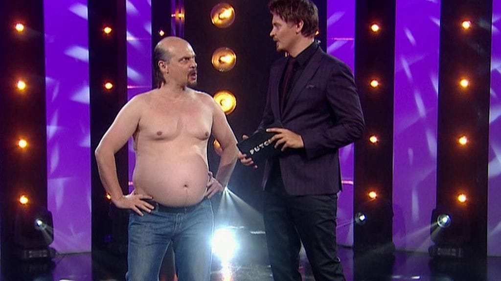 Pulkkinen asteli estradille tutusti komeassa olemuksessaan ilman paitaa. Komediahahmo jutteli juontaja Roope Salmisen kanssa muun muassa Salmisen tyttöystävästä Sara Siepistä.