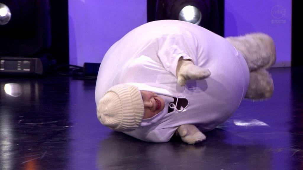 Alina Tomnikov esitti Riku Niemisen sketsihahmoa Munamiestä. Tomnikov asteli estradille, mutta kellahti matkalla kumoon saaden yleisön repeämään. Muut näyttelijät auttoivat Tomnikovin lopulta pystyyn.