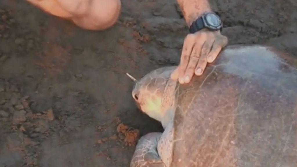 Joukko kansainvälisen Leatherback Trust's -järjestön edustajia oli joulukuun alussa tutkimassa merikilpikonnien pesimistä Costa Ricassa, kun turisti riensi heidän luokseen ja kertoi kilpikonnasta, jonka sieraimeen oli juuttunut jotain.