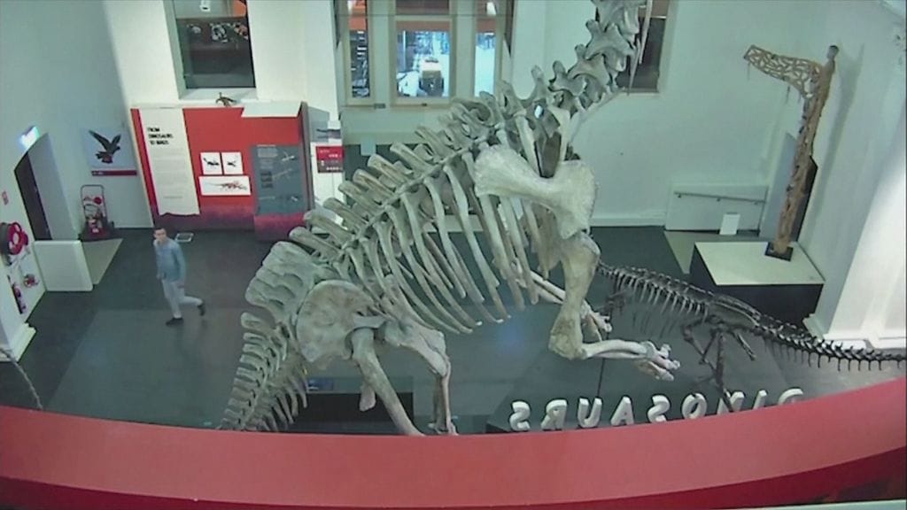 Valvontakameratallenteelta näkyy, miten Kuhn ottaa selfien muun muassa dinosauruksen kallon kanssa.