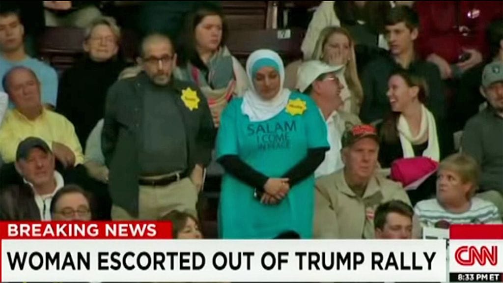 Mutta yleisö hänen ympärillään alkoikin hurraamaan kovaan äänen ”Trump Trump” ja vaativat naista lähtemään pois.