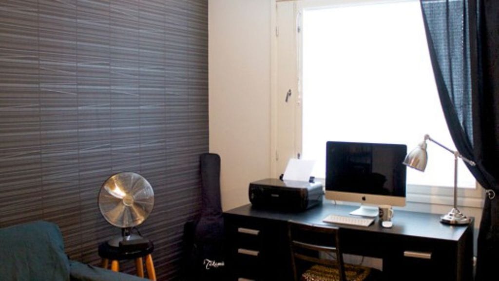 Mustapohjainen, ohuilla vaakaraidoilla rytmitetty tapetti oli nappivalinta huoneen katseenvangitsijaksi. Appiukko hieman epäröi tapetoida huonetta mustalla, mutta joutui työn valmistuttua myöntämään, että seinällä se näyttää ”peijakkaan hyvältä”. Tapettiseinän vastainen seinä ja päätyseinät maalattiin vaalealla harmaalla.