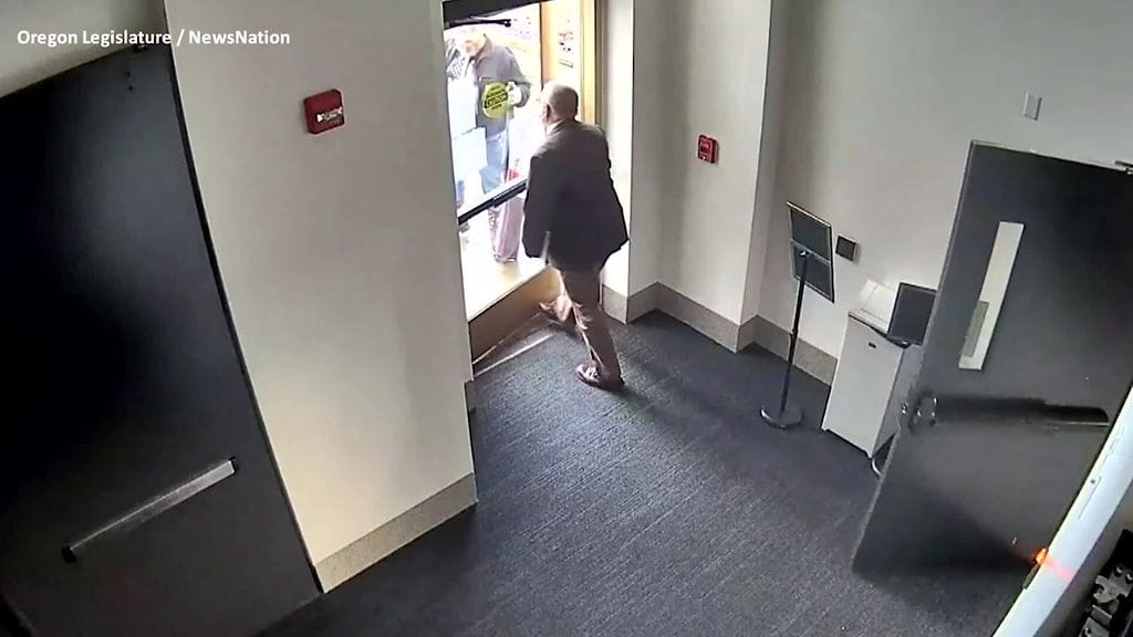 Joulukuun 21. päivänä kuvattu nauhoitus näyttää, miten muun muassa Donald Trumpin kannatuskyltein ja Amerikan lipuin varustautuneet mielenosoittajat seisovat Oregonin parlamenttitalon ulkopuolella sivuoven edessä. Rakennuksessa oli käynnissä edustajien istunto, ja se oli suljettu yleisöltä koronarajoitusten vuoksi.