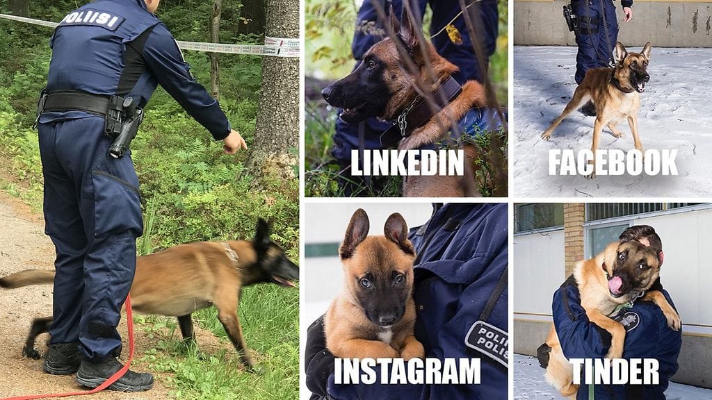 Itä-Suomen poliisin Instagram-tilillä julkaistiin hykerryttävä kuva, jossa poliisikoirat poseerasivat neljässä otoksessa. Kuvat oli valittu sen perusteella, mikä kuva olisi voitu julkaista profiilikuvana poliisikoiran eri sosiaalisen median palveluissa.