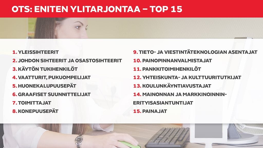 Ylitarjonta-ammattien listalla on myös tapahtunut muutoksia. Uusina ammatteina ylitarjonnan top 15 -listalle ovat nousseet käytön tukihenkilöt, konepuusepät, pankkitoimihenkilöt ja koulunkäyntiavustajat.