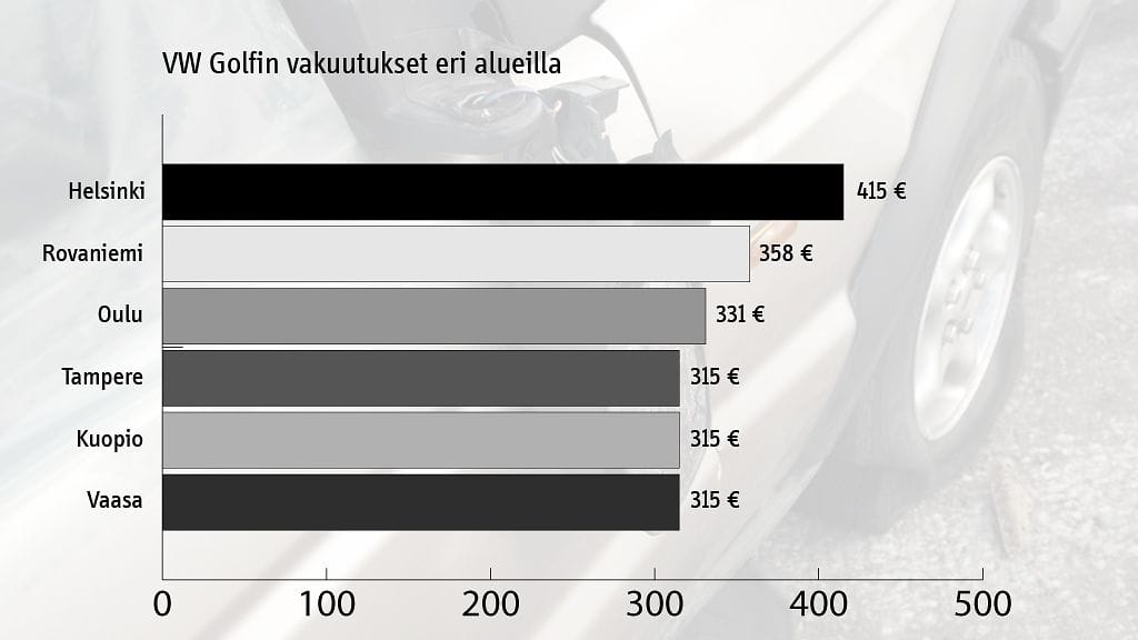 Tulos on selvä. Vakuutusyhtiöiden hinnoittelussa suomalaisten suosikkiauton Volkswagen Golfin laaja autovakuutus nousee vuodessa 70–100 euroa kalliimmaksi Helsingissä kuin Tampereella, Kuopiossa tai Vaasassa. Tarkat summat löytyvät . Myös vakuutusyhtiöiden hinnoitteluissa on eroja.
