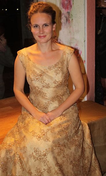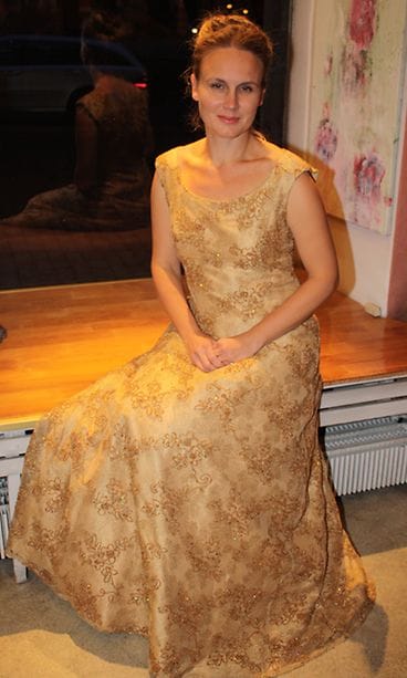 – Iltapukuni on myös käytännöllinen, sillä tarvittaessa voin ottaa pitsiosion kokonaan pois ja käyttää alla olevaa kullanhohtoista silkkipukua. Pukuni on suunnitellut muotisuunnittelija Marja-Liisa Penttilä.