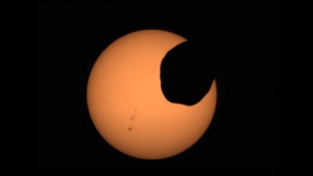 Perseverance nappasi otoksen huhtikuun alussa. Marsin auringonpimennys kesti vain noin 40 sekuntia, jonka aikana planeettaa kiertävä Phobos-kuu kulki Auringon edestä. Phobos ei peitä Aurinkoa kokonaan taakseen eikä ihmekään, sillä se on noin 157 kertaa pienempi kuin meidän oma kuumme.