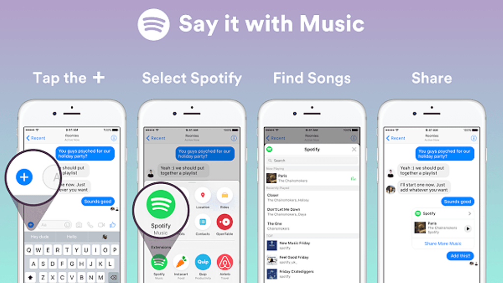 Spotify-jako toimii helposti kuvan ohjeiden mukaisesti. Aluksi painetaan +-kuvaketta kirjoitusalueen vierestä, jonka jälkeen valittavissa on Spotify, haulla voi etsiä haluamansa ja jakaa sen. Toistaiseksi vastaanottaja pääsee kuulemaan jaetusta kappaleesta 30 sekunnin mittaisen pätkän. Tähän voi jatkossa tulla mahdollisesti muutos, mutta vielä nyt koko kappaleen kuuntelemiseksi joutuu siirtymään Spotify-sovellukseen.