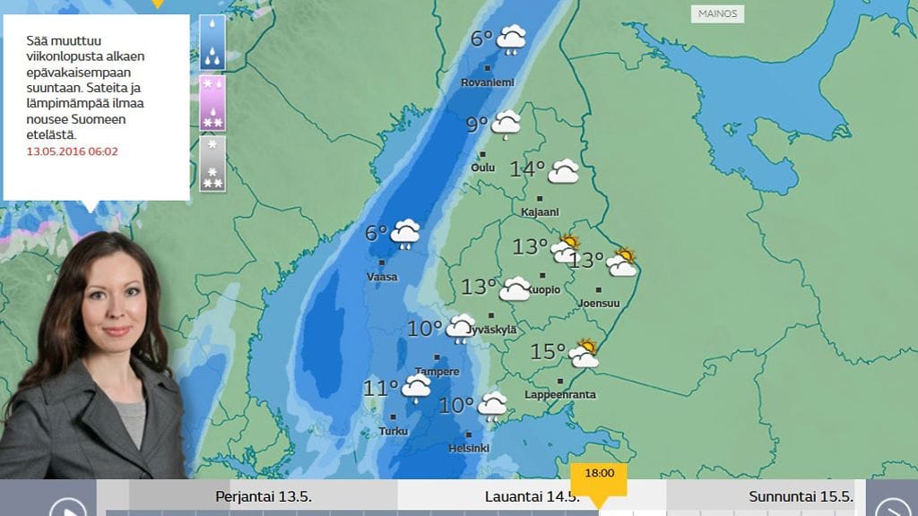 Viikonlopuksi ennustetaan runsaita sateita Länsi-, Pohjois- ja paikoin Etelä-Suomeen. Idässä on laajalti poutaa ja lämmintä.
