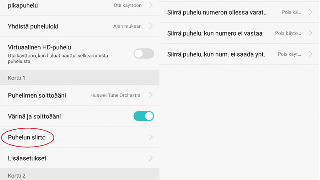 Näin kytket soitonsiirron päälle (Huawei Mate8, EMUI):