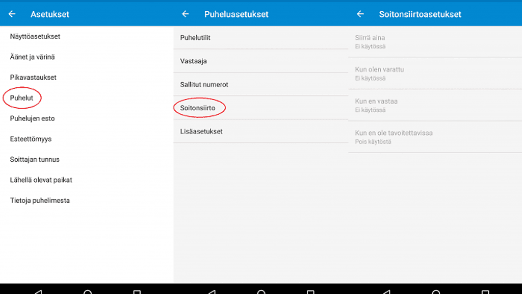 Eri Android-puhelinten valmistajien käyttöliittymät eroavat toisistaan paljon, joten aivan samalla tavalla soitonsiirron päälle kytkeminen ei tapahdu, mutta perusperiaate on sama. Tässä artikkelissa esimerkkilaitteina toimivat Googlen Nexus 5X, joka toimii puhtaalla Androidilla, ja Huawei Mate 8:n, jossa on Androidin päällä EMUI-käyttöliittymä.