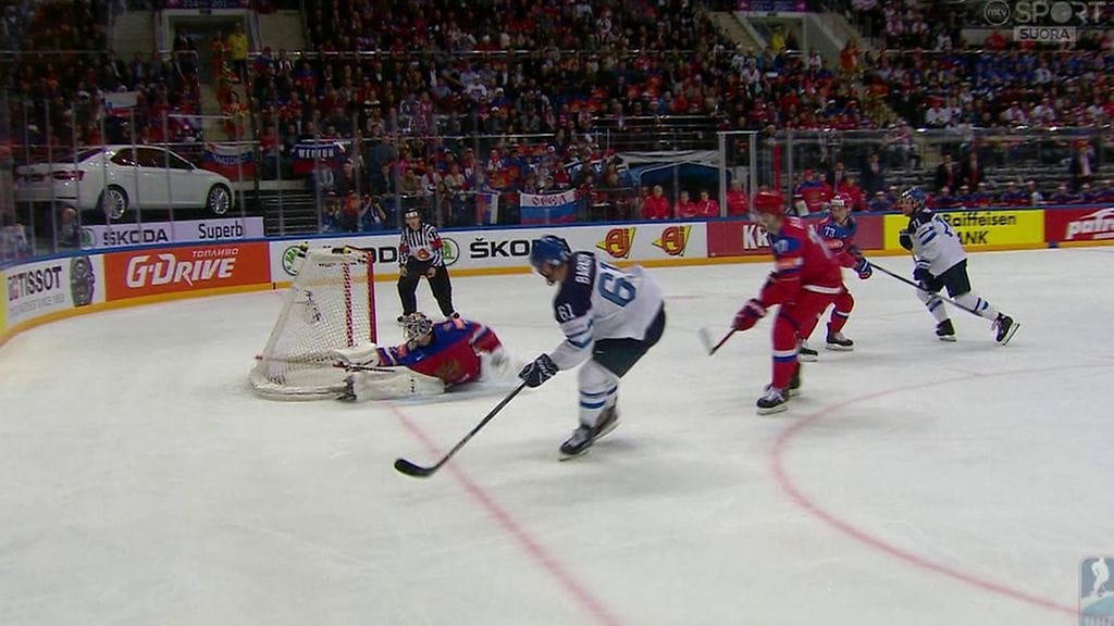 Aleksandr Barkovilla oli loistava tilaisuus tasoittaa jääkiekon MM-välieräottelu Venäjää vastaan, mutta veto osui epäonnisesti tolppaan.