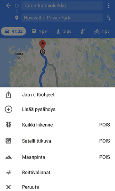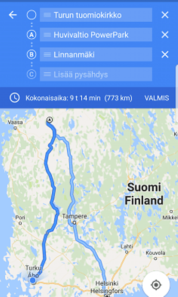 Google Maps on näppärä kartta- ja navigointisovellus, johon voi tarvittaessa syöttää myös useampia kohteita, eli reissun lopullisen määränpään lisäksi voi matkalle merkitä myös välietappeja. Jos kesälomareissulla halutaan ennen huvipuistoa pysähtyä katsomaan vanhoja kivikasoja, voi reittiohjeet määritellä heti alussa kulkemaan kivikasojen kautta huvipuistolle.