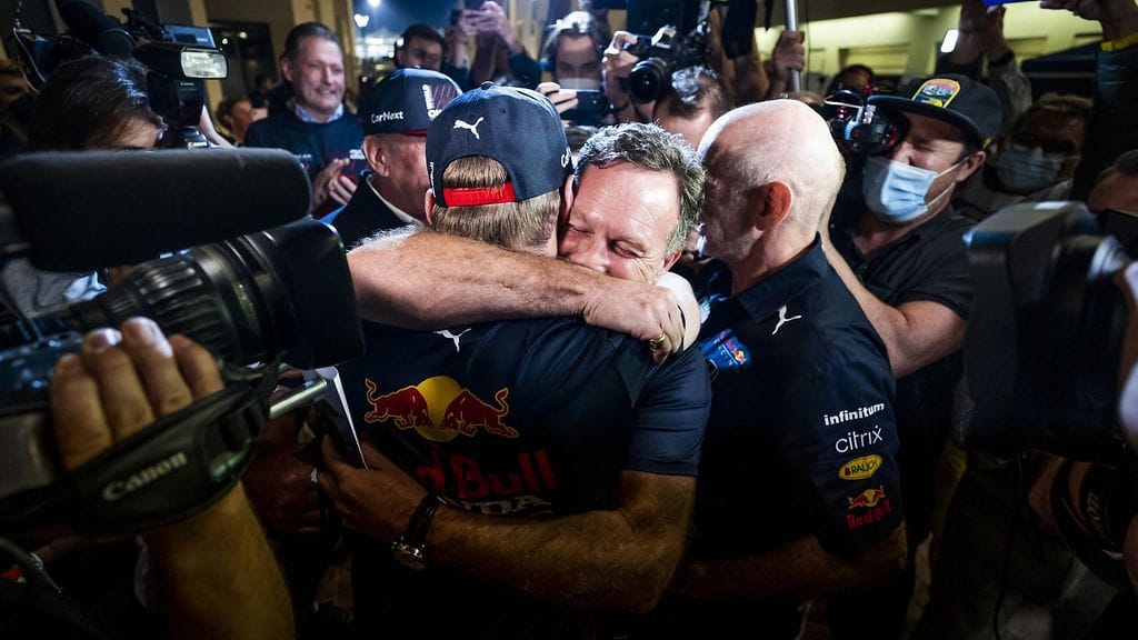 Pääkuvan video: Red Bull -johto poistuu tuomariston tiloista ja vie ilouutiset maailmanmestaruudesta Max Verstappenille.