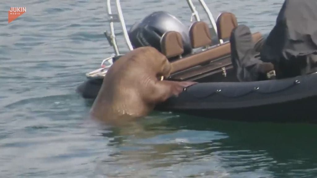Haminan ja Kotkan seudulla hämmentänyt mursu aiheutti sunnuntaina pienimuotoisen hässäkän, kun se yritti nousta kalastajan veneeseen ja vene kaatui yrityksestä. Video todistaa, että mursu voi ponnistaa veneeseen myös turvallisesti.