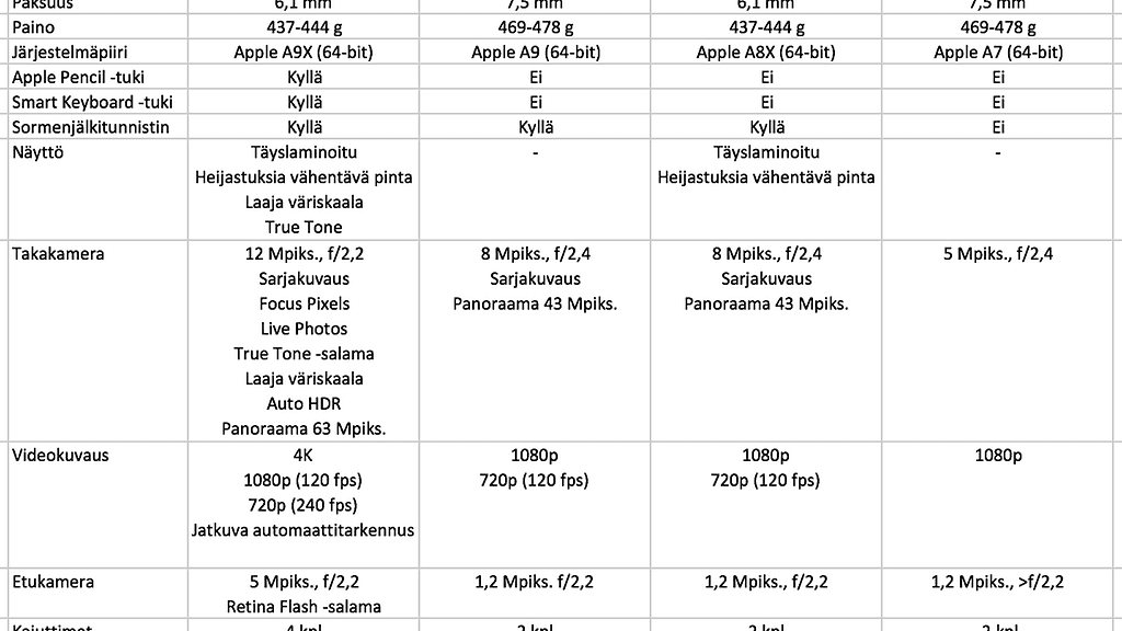 Kaikkia alta löytyvän taulukon tabletteja yhdistävät esimerkiksi iOS 10 -ohjelmisto, 9,7 tuuman näyttö 2048×1356 pikselillä ja tismalleen sama koko pituus- ja leveyssuunnassa. Paksuudessa ja painossa on eroja.