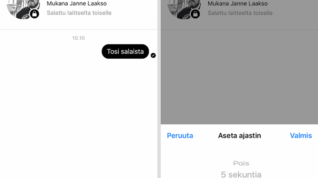 Lisäksi Facebook Messenger tarjoaa Snapchatista tutun mahdollisuuden asettaasalattujen viestiketjujen viesteille ajastimen, jonka ajan jälkeen viesti katoaa näkyvistä keskustelusta vastaanottajan sen avattua.