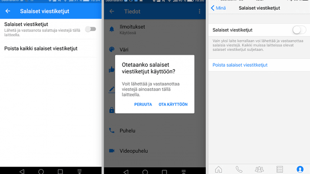 Salaiset viestit Facebook Messengerissä tarkoittavat alusta loppuun, laitteesta toiseen täysin salattuja, kryptattuja viestejä, joita edes Facebookin algoritmit ja muut ohjelmistot eivät pääse lukemaan – eikä se tietoja näin voi luettavassa muodossa viranomaisillekaan luovuttaa.