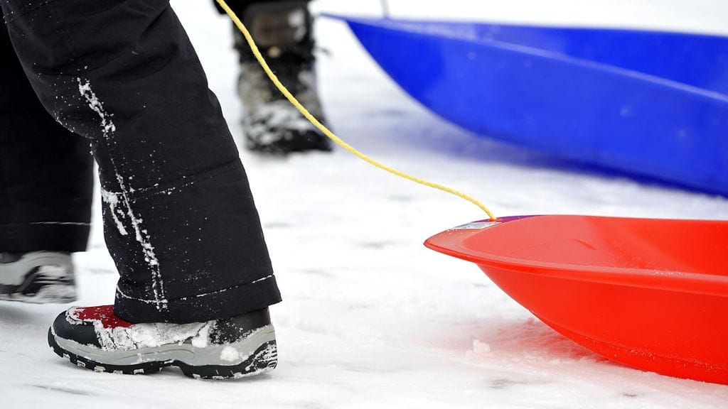 Muista laskiessa pitää molemmat jalat pulkan sisäpuolella tai rattikelkan jalaksilla!