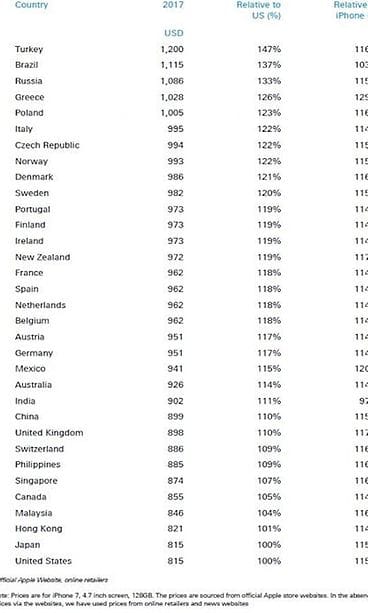 Vertailun kallein maa oli Turkki, jossa iPhone 7 maksoi 1 200 dollaria. Se on jopa 47 prosenttia enemmän kuin edullisimmassa maassa. iPhonen korkeaan hintaan Turkissa vaikuttaa liiran heikko arvo. Halvimmillaan puhelimen saa 815 dollarilla Yhdysvalloista tai Japanista.