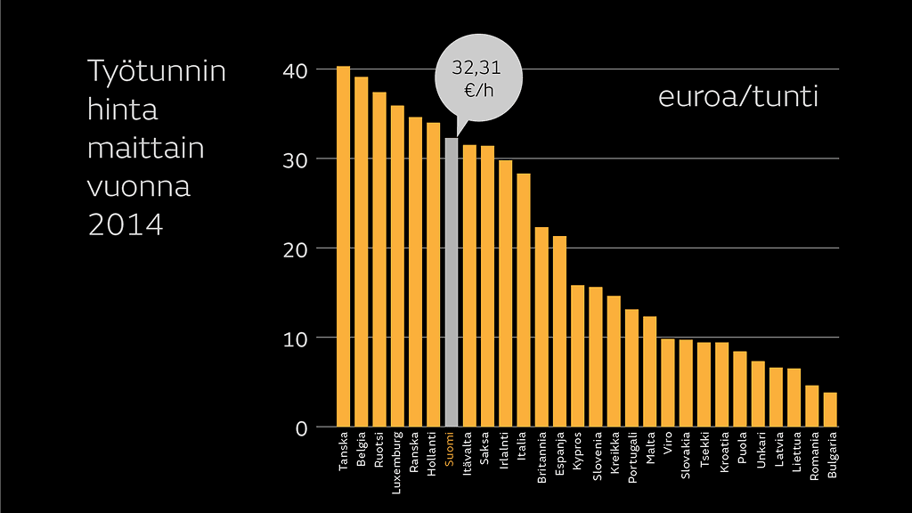 Suomea kalliimpaa on Tanskassa, Belgiassa, Ruotsissa, Luxemburgissa, Ranskassa ja Hollannissa. Vertailun kärkimaa on Tanska, jossa työtunti maksaa 40,3 euroa.