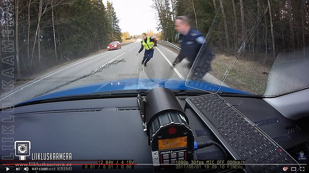 Toukokuun ensimmäisenä päivänä Viron Jõgevamaalla kuvatulla videolla nähdään piikkimattoa käyttävältä poliisilta suoritus, joka kelpaisi oppikirjaan.