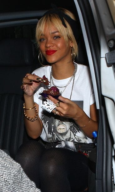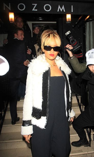 Myöhemmin illalla Rihanna nähtiin hänen suosikkiravintolassa juhlimassa. Lontoossa sijaitseva Nozomi-ravintola on erikoistunut japanilaiseen keittiöön. Ravintolassa Rihanna juhli tyylikkäässä mustavalkoisessa asussa ja kultaisissa korvarenkaissa.
