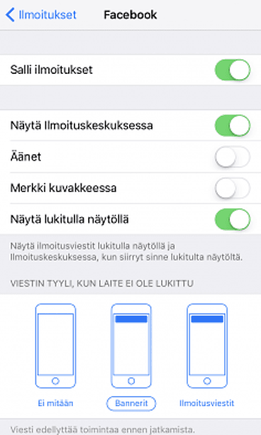 Mahdollisesti ilmoituksia lähettävät sovellukset kysyvät ensimmäisellä kerralla lupaa ilmoituksille, eli esimerkiksi juuri viestisovelluksille voi olla järkevää antaa lupa, kun taas pelit eivät välttämättä oikeuksia tarvitse. Jos asetuksia haluaa myöhemmin muuttaa, se onnistuu ilmoitusasetuksista.