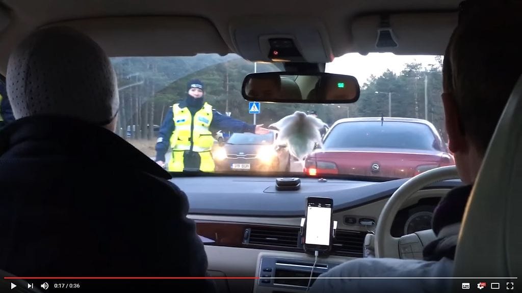 Poliisi ei huomaa, että autossa on ratti oikealla eli väärällä puolella. Nollat taulussa puhallutuksia liukuhihnalta tekevä poliisi tuikkaa pillin suoraan matkustajan suuhun ja sen enempää kyselemättä päästä auton jatkamaan matkaansa.