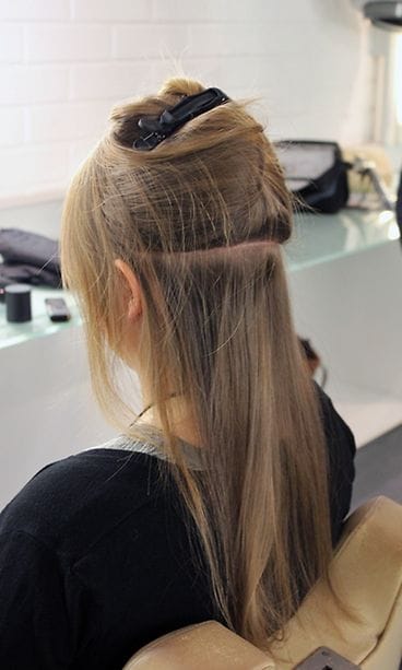2. Aloita osittelemalla hiukset kolmeen osaan esimerkiksi korvalta korvalle. Kokoa loput hiukset nipsuilla pään päälle. Tämä helpottaa hiusten käsittelyä.