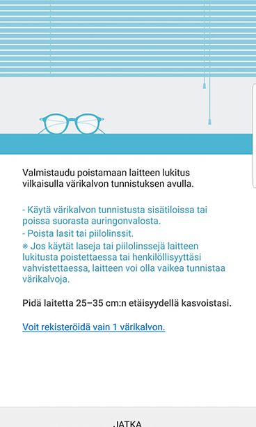 Samsungin mukaan silmälasit tai piilolinssit sekä näytön suojakalvot voivat haitata skannerin toimintaa, ja ainakin itselläni silmälasit tuntuivat hyvin merkittävästi haittaavan skanneria. Pikaisen testin perusteella piilolinssit eivät olleet yhtä iso ongelma tunnistautumiselle.