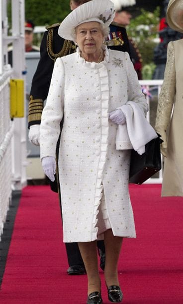 Juhlan 86-vuotias päätähti hehkui onnellisena ja tyylikkäänä. Kuningatar Elisabet oli pukeutunut valkoiseen pukuun, jonka oli loihtinut luottosuunnittelija Angela Kelly. Daily Mailin mukaan puvun tekoon oli käytetty vuoden päivät.
