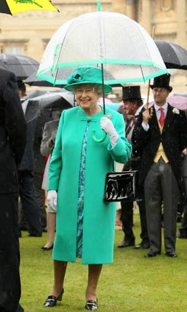 Sateenvarjon ei todella tarvitse olla tylsä. Vaikkapa omaan pirteään asukokonaisuuteen sointuva värillinen varjo on mukava napata matkaan synkän päivän piristeeksi. Iso-Britannian kuningatar Elisabeth II näyttää mallia sateenvarjovalinnallaan, joka on samaa sävyä hänen turkoosin takkinsa kanssa.