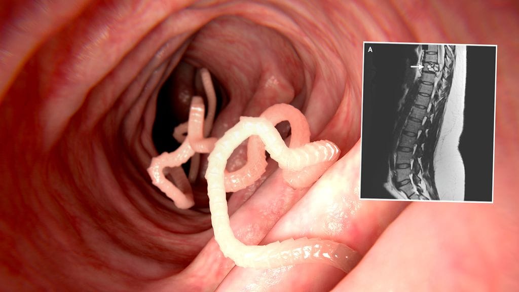 The New England Journal of Medicine -verkkojulkaisussa nimittäin todetaan, että lääkärit löysivät naisen selkärangasta Echinococcus granulosus -lajin heisimadon. Keskelle selkärankaa pesiytynyt loinen oli poistettava leikkauksella.
