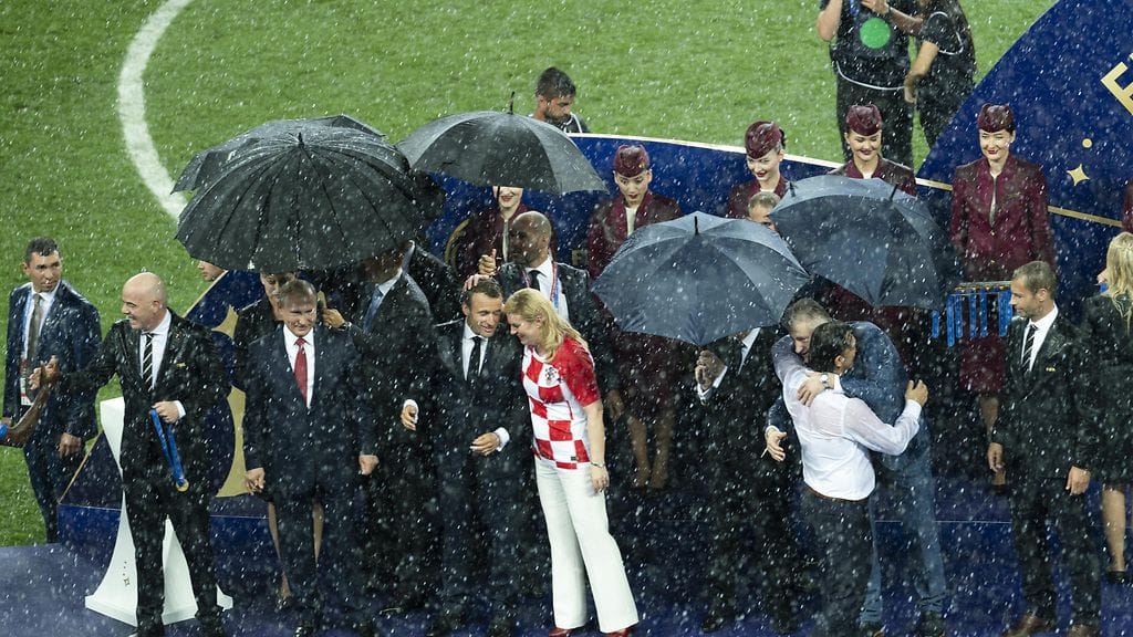 Kesken vesisateen suoritetussa mitalienjaossa tapahtuu outo tilanne. Kansainvälisen jalkapalloliiton Fifan johtajiin kuuluva Marion Mayer-Volvelder sujauttaa Venäjän presidentti Vladimir Putinin takana yhden kultamitalin taskuunsa. Kuvissa etualalla on Ranskan supertähti Antoine Griezmann.