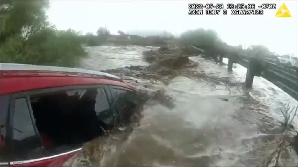 Poliisin kehokameraan tallentui dramaattinen pelastusoperaatio, kun nainen pelastettiin tulvan keskelle joutuneesta autosta Arizonassa.
