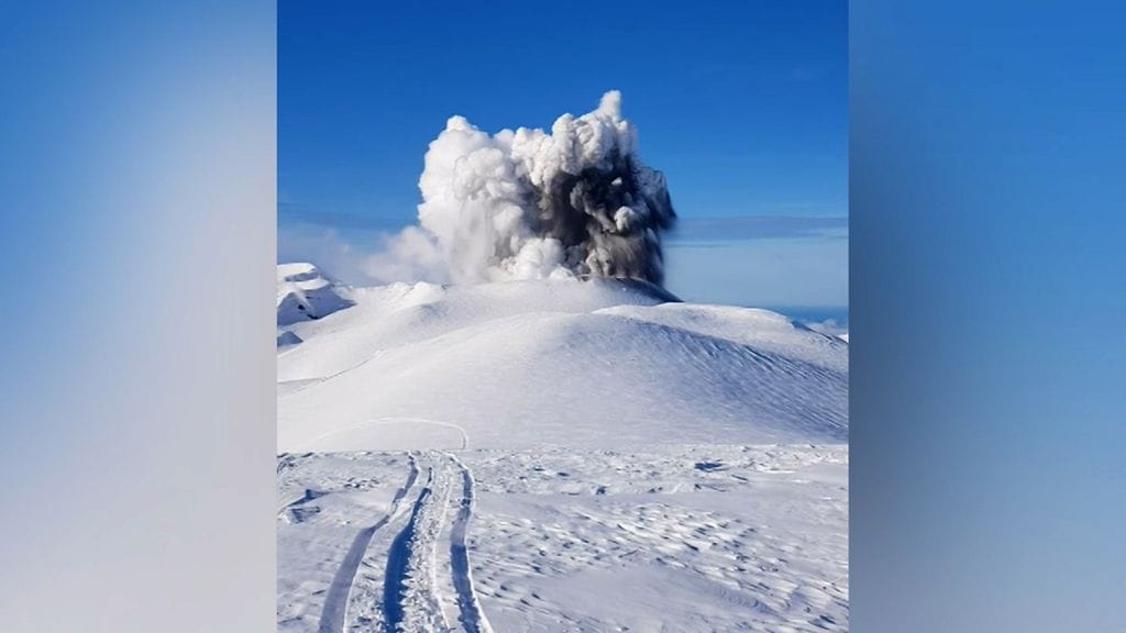 Katso ylhäällä olevalta videolta, kuinka lumisen vuorenhuipulla purkautuu tulivuori!