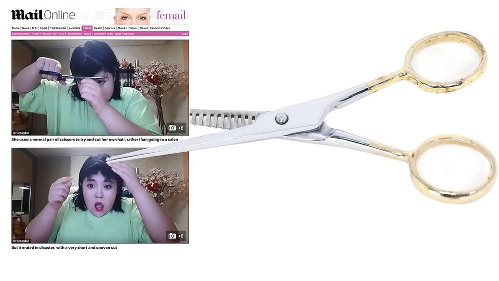 Videolla Yang Bin -niminen nainen näyttää, miten "helppoa" oma otsatukka on trimmata. Samalla hän leikkaa saksilla sormeensa – eikä siitä otsatukastakaan kovin suoraa tule.