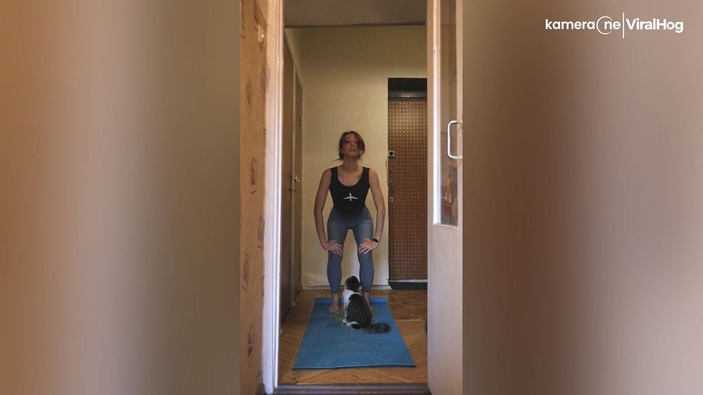 Venäläisnainen on jakanut kuvaamansa videon joogahetkestään, joka jatkuvasti keskeytyy malttamattoman kissan hyökkäyksiin.
