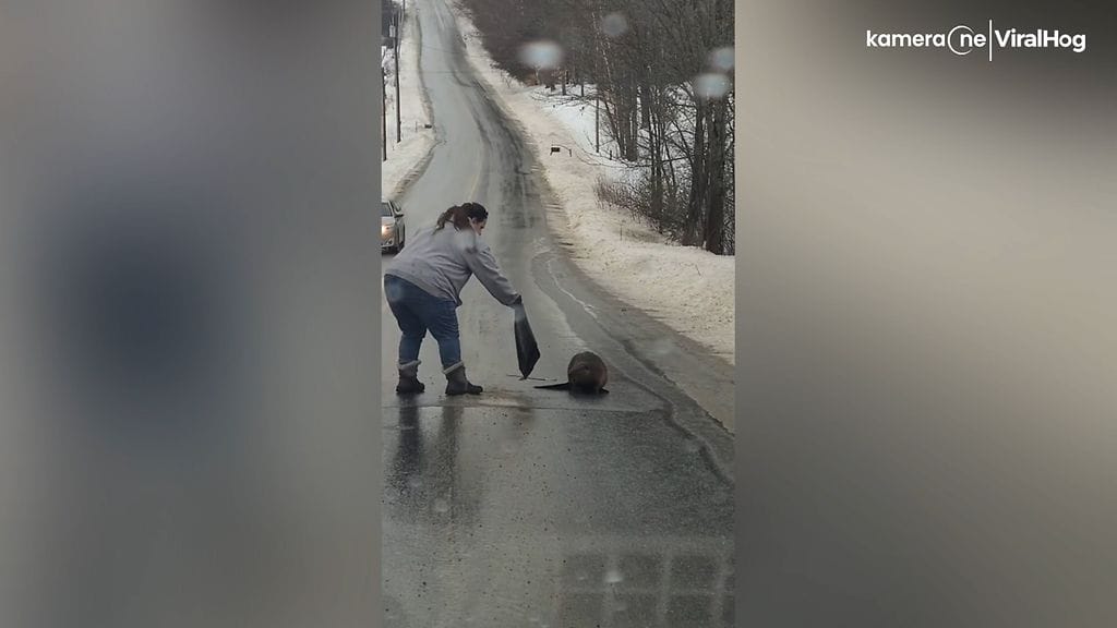 Paikalle sattuivat autolla ajaneet siskokset, jotka eivät ilmeisesti päässeet sohjoisella tiellä ohittamaan turvallisesti suolaista välipalaa nauttinutta majavaa.