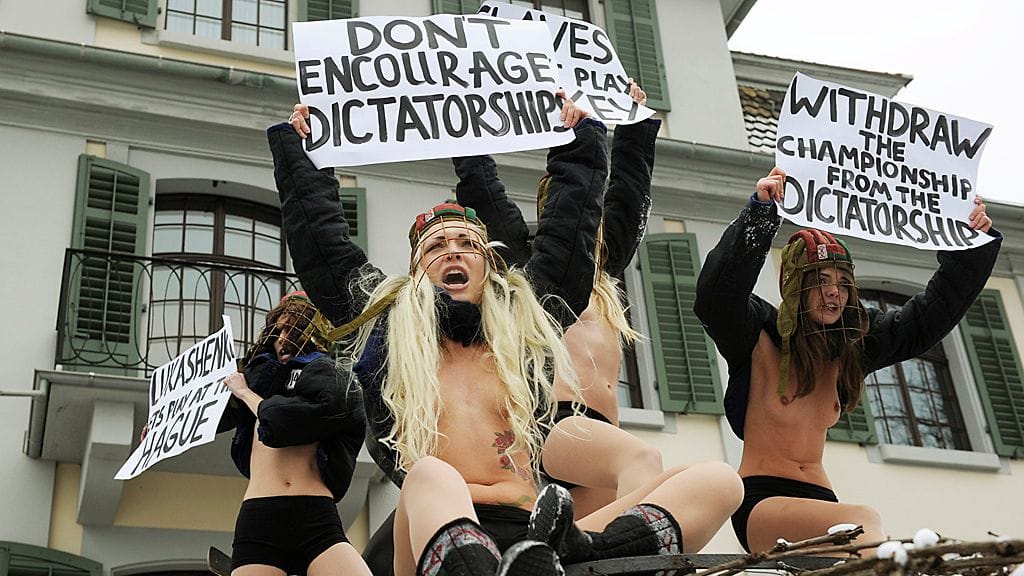 Ukrainalainen naisten oikeuksia puolustava Femen-järjestö oli järjestänyt Kansainvälisen jääkiekkoliiton IIHF:n päämajan edessä mielenosoituksen, jossa ei säästelty iskulauseita eikä paljasta pintaa. Mielenosoitukseen osallistuneet naiset uhmasivat Zürichin pikkupakkasta rinnat paljaana.